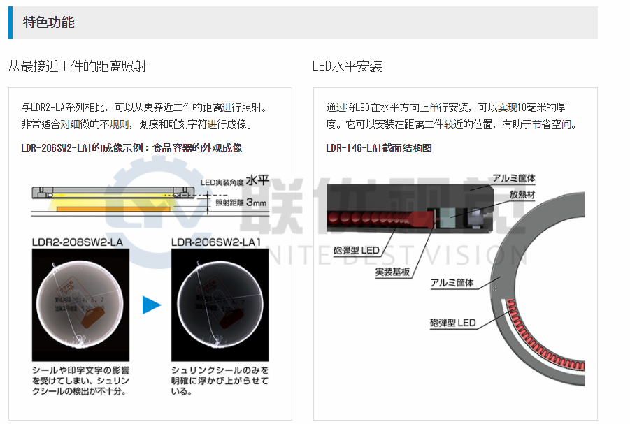 LED垂直地安裝在線形基板上。環(huán)形排列的LED彼此水平相對地照明。薄型設(shè)計,厚度為10mm。可以盡可能靠近工件使用。