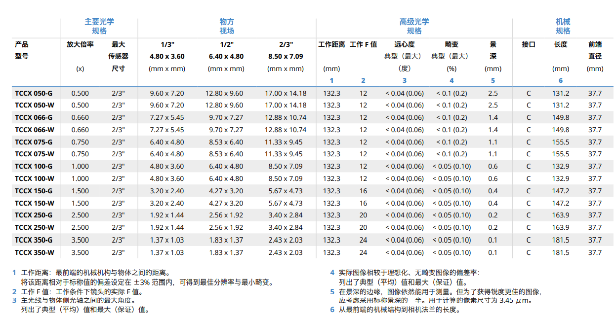 • TCCX 系列是一組專為平面測量和缺陷檢測而設(shè)計的遠(yuǎn)心鏡頭,可提 供與 TCLWD 系列相同的放大倍率和工作距離,同時增加了集成式同 軸光源。